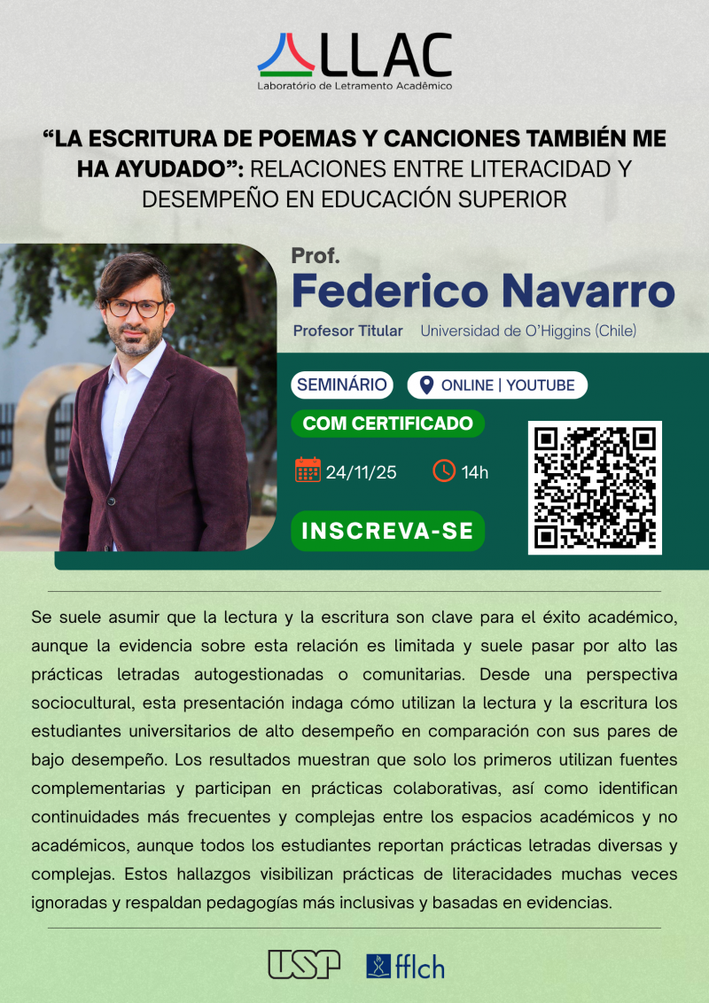 Biodata: Federico Navarro es Doctor en Lingüística y Profesor Titular en la Universidad de O’Higgins (Chile), donde fue Director de la Escuela de Educación. Ha obtenido becas de investigación en Argentina, Brasil, España, Estados Unidos y Alemania, y ha liderado diez proyectos científicos sobre lenguaje, escritura y aprendizaje en Argentina y Chile, con un financiamiento total cercano al millón de dólares. Fue Presidente de la Asociación Latinoamericana de Estudios de la Escritura y forma parte del comité científico de 22 revistas y editoriales internacionales. Ha sido invitado como plenarista o panelista en más de 100 congresos en América, Europa y Asia. Es autor y editor de 15 libros y ha publicado más de 50 artículos académicos. Su investigación actual se centra en las relaciones entre escritura y desempeño académico, así como en las transformaciones de los escritores al ingresar al mundo laboral.