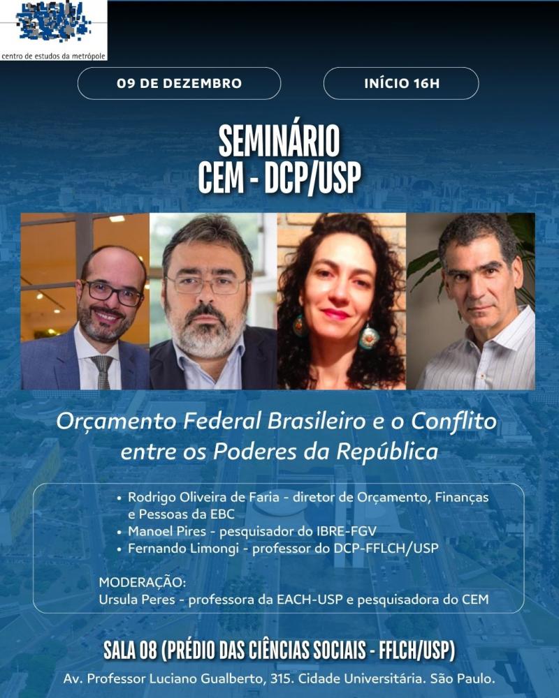 Em parceria com o Programa de Pós-Graduação em Ciência Política do Departamento de Ciência Política da Faculdade de Filosofia, Letras e Ciências Humanas da Universidade de São Paulo (DCP/FFLCH-USP), o Centro de Estudos da Metrópole (CEM-Cepid/Fapesp) promove o último seminário deste ano, no dia 9 de dezembro, às 16h. Na ocasião será debatido o tema “Orçamento Federal Brasileiro e o Conflito entre os Poderes da República”.