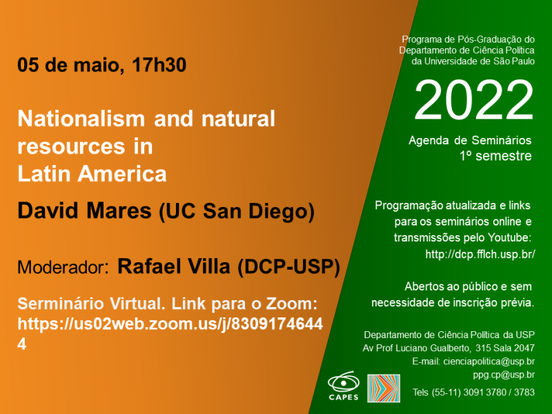 Seminário “Nationalism and natural resources in Latin America", com David Mares (UC San Diego), dia 05 de maio de 2022, às 17h30.