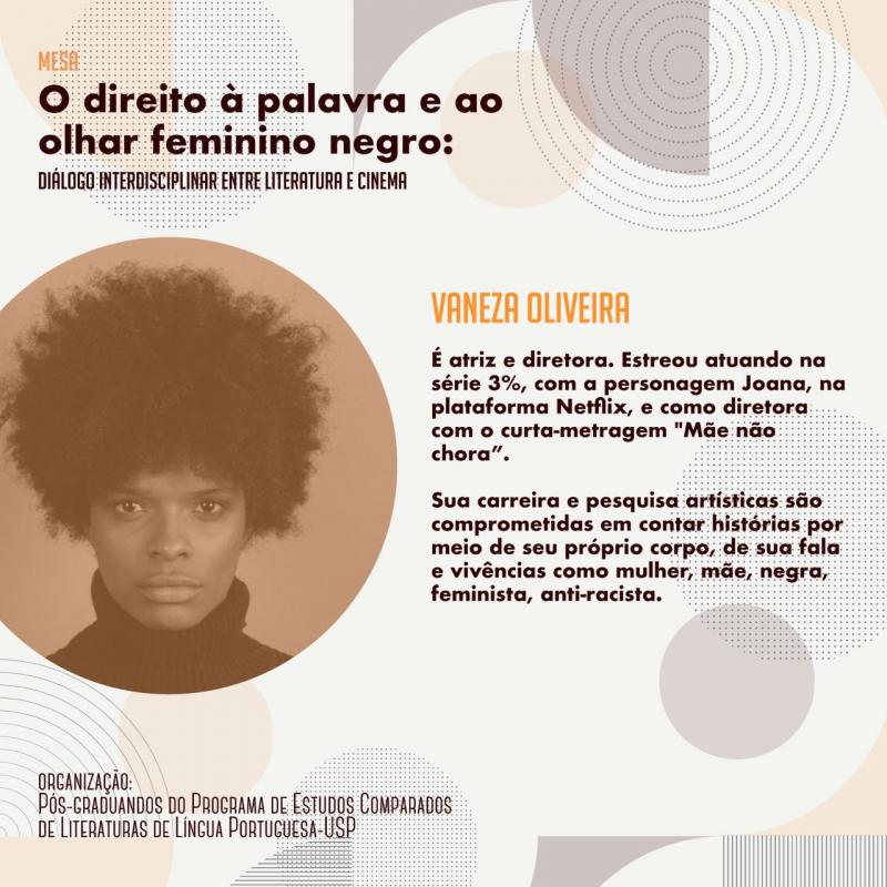 Vaneza Oliveira tem 32 anos, é atriz e diretora. Nasceu em Eunápolis, município da Bahia. Aos seis anos se mudou para São Paulo, onde vive atualmente, e aos 17 se tornou mãe-solo. Começou a estudar teatro em 2013 e fez sua estreia como atriz na plataforma Netflix, com a personagem Joana, na série 3%. Estreiou como diretora no seu primeiro curta metragem“ Mãe não chora” Sua carreira e pesquisa artística são comprometidos em contar histórias por meio de seu próprio corpo, de sua fala e vivências como mulher, mãe, negra, feminista, anti-racista.