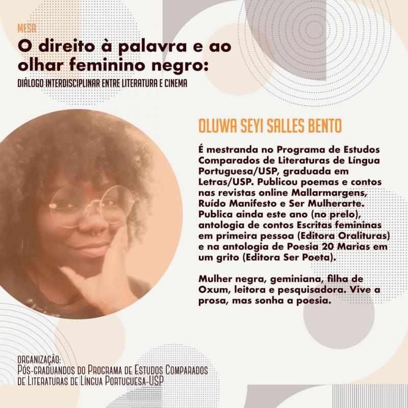 Oluwá Seyi Salles Bento é mestranda no Programa de Estudos Comparados de Literaturas de Língua Portuguesa/USP, graduada em Letras/USP, mulher negra, geminiana, filha de Oxum, leitora e pesquisadora. Vive a prosa, mas sonha a poesia.