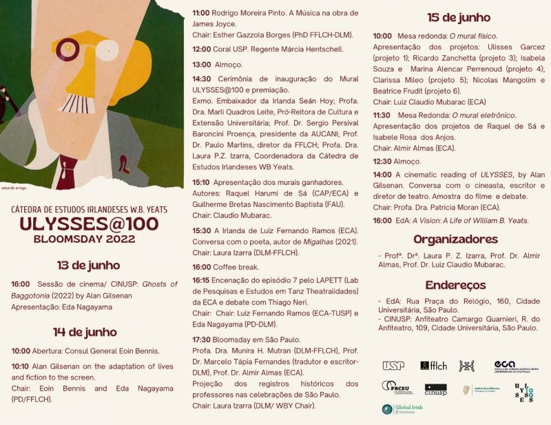 Para comemorar os 100 anos da publicação do ULYSSES, de James Joyce, a Cátedra promove palestras, filmes, teatro e murais com a presença do diretor e cineasta irlandês Alan Gilsenan e professores e alunos artistas da USP, na semana do Bloomsday.